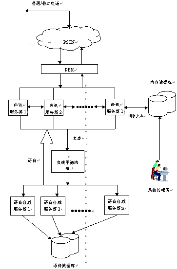 當(dāng)用戶通過電話向聲訊服務(wù)器發(fā)出請(qǐng)求時(shí),聲訊服務(wù)器會(huì)首先作出分析判斷,然后從內(nèi)容數(shù)據(jù)庫中提取相應(yīng)的文本信息,經(jīng)過負(fù)載平衡機(jī)制發(fā)送給語音合成服務(wù)器。語音合成服務(wù)器在接收到文本后立刻開始合成,同時(shí)將合成好的語音發(fā)送回語音服務(wù)器,再由語音服務(wù)器回傳給用戶。其中內(nèi)容數(shù)據(jù)庫中的信息可以由系統(tǒng)管理員定期進(jìn)行維護(hù)管理。(系統(tǒng)連接結(jié)構(gòu)見流程圖)