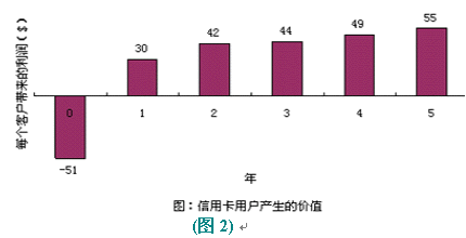以信用卡服務(wù)為例,爭(zhēng)取一個(gè)新的用戶平均要51美圓,用于廣告、推銷和開戶等開支。用戶開始時(shí)花錢很少,但為公司帶來(lái)一定的利潤(rùn)。但如果用戶繼續(xù)使用到第二年,就會(huì)為公司帶來(lái)更多的經(jīng)濟(jì)效益,因?yàn)楣九c客戶之間的信任和客戶對(duì)公司的滿意,致使客戶更多地通過(guò)信用卡消費(fèi)。(圖:"信用卡用戶產(chǎn)生的價(jià)值")用戶貢獻(xiàn)在增加,公司的運(yùn)作費(fèi)用卻在不斷減低。信用卡公司可以不斷減少對(duì)客戶信用的審核時(shí)間。保持長(zhǎng)期的客戶關(guān)系,還可以減少?gòu)V告支出,客戶本身就是一個(gè)免費(fèi)的廣告資源。很多人在消費(fèi)前喜歡聽取朋友的意見(jiàn),覺(jué)得比廣告更可信。