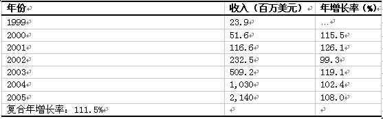 下表及下圖,顯示了Frost & Sullivan 公司預(yù)測1999年到2005年整個歐洲ASP統(tǒng)一信息產(chǎn)品市場收入增長及增長率情況。