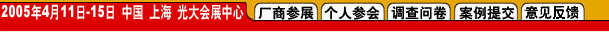 展覽大廳開(kāi)放時(shí)間:2005年4月13日1:30pm —— 4月15日 03:30pm 注:以上日程內(nèi)容,將根據(jù)參展廠(chǎng)商提交資料的進(jìn)展情況隨時(shí)更新,敬請(qǐng)留意。