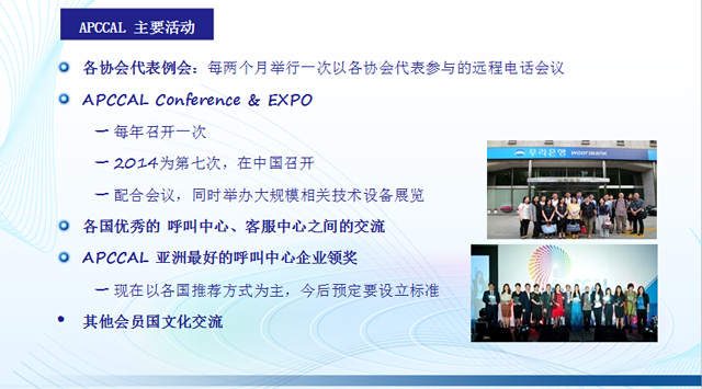 為了亞洲各國(guó)的與呼叫中心、客服中心相關(guān)的產(chǎn)業(yè)信息的共享和通過(guò)實(shí)質(zhì)性的交流,以更好的相互發(fā)展各會(huì)員國(guó)的呼叫中心、客服中心產(chǎn)業(yè)為目的。