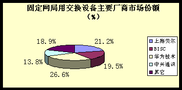 (2)市場特點:市場份額進一步向業(yè)內領先者集中,華為技術、上海貝爾、BISC 依然保持該領域三甲地位,市場份額占市場總量的67.3%。上述三家廠商各自的市場份額分別占到市場總量的26.6%、21.2%、19.5%。 此外,以中興通訊 、華為技術為代表的非外資設備廠商積極開拓國外市場以實現(xiàn)其國際化發(fā)展戰(zhàn)略。 中心城市市場趨于飽和,市場競爭焦點向本地網(wǎng)機型拆換和中小城市以下市場轉移。激烈的價格競爭導致該市場平均利潤微薄。