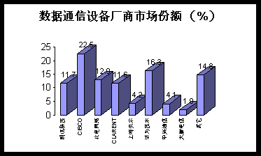 (2)市場特點:由于非外資設備廠商的崛起,數(shù)據(jù)通信產(chǎn)品價格持續(xù)下降,中低端產(chǎn)品競爭尤為激烈。華為、中興等公司在高端接入服務器、路由器等領域已取得突破,市場份額穩(wěn)步攀升,在高端接入服務器領域,非外資品牌已占到60%以上的份額。IP網(wǎng)絡設備繼續(xù)被CISCO等少數(shù)公司壟斷、非外資廠商試圖有所作為但收效甚微。運營商高漲的投資熱情與設備廠商的大力推動,是數(shù)據(jù)產(chǎn)品市場迅速擴張的拉動力量,網(wǎng)絡帶寬的不足以及運營商Qos的局限依然是該市場飛躍發(fā)展的瓶頸因素。