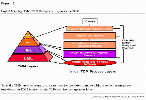 國(guó)際電聯(lián)的出發(fā)點(diǎn)雖好,但它更強(qiáng)調(diào)從網(wǎng)絡(luò)元素層開始的清晰的統(tǒng)一體系,而為了保護(hù)自己的商業(yè)秘密,各大運(yùn)營(yíng)商往往不希望公開自己的網(wǎng)絡(luò)元素層的標(biāo)準(zhǔn),同時(shí),網(wǎng)絡(luò)元素層的標(biāo)準(zhǔn)化對(duì)運(yùn)營(yíng)商的業(yè)務(wù)發(fā)展幫助不大。在熱烈討論了一段時(shí)間之后,TMN漸漸被忽視了。而另一只希望從技術(shù)角度解決管理問(wèn)題的力量,電信管理論壇,卻帶有一定偶然性地逐漸確立了自己的地位。電信管理論壇在開始的時(shí)候并沒有夢(mèng)想能建立覆蓋整個(gè)電信運(yùn)營(yíng)企業(yè)的管理系統(tǒng),其初衷是解決在當(dāng)時(shí)日漸突出的跨企業(yè)的客戶數(shù)據(jù)交換問(wèn)題。因此,和國(guó)際電聯(lián)不同,電信管理論壇從開始就非常強(qiáng)調(diào)實(shí)用性,并把目光集中到了各企業(yè)相互間有大量數(shù)據(jù)交換,因此迫切需要建立標(biāo)準(zhǔn)的服務(wù)管理層和網(wǎng)絡(luò)管理層,并提出了電信運(yùn)營(yíng)支持系統(tǒng)(OSS)的概念,并公布了模塊化的電信運(yùn)營(yíng)導(dǎo)圖(TOM)。