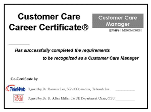 學(xué)員在經(jīng)過(guò)完整的課程培訓(xùn)之后,經(jīng)考試合格,可以獲得由美國(guó)俄亥俄州立大學(xué)與太維資訊有限公司聯(lián)合頒發(fā)的的專業(yè)培訓(xùn)證書(shū)?蛻舴⻊(wù)中心認(rèn)證的目的有兩個(gè):首先,對(duì)于已經(jīng)在客服中心從業(yè)的人員,太維公司的培訓(xùn)可以提供一個(gè)提升他們工作能力的機(jī)會(huì),通過(guò)培訓(xùn)后不同層次的專業(yè)培訓(xùn)認(rèn)證,太維公司以行業(yè)的標(biāo)準(zhǔn)要求對(duì)他們的提升加以證明,以加強(qiáng)他們?cè)谛袠I(yè)中的競(jìng)爭(zhēng)能力。其次,對(duì)于有志致力于在客戶服務(wù)行業(yè)從業(yè)的人事,太維公司廣泛深入、滿足各種需求的專門技術(shù)培訓(xùn)與相應(yīng)的不同層次的認(rèn)證,為他們進(jìn)入該行業(yè)提供一個(gè)標(biāo)準(zhǔn)的素質(zhì)證明,以使他們能夠順利勝任客戶服務(wù)中心的各種主要的工作職位。