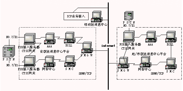 全國(guó)短消息統(tǒng)一平臺(tái)是在省局短消息中心上架構(gòu),各省局下設(shè)地/市局短消息中心。各地短消息中心通過INTERNET連接,交互信息,ICP業(yè)務(wù)商和其他業(yè)務(wù)平臺(tái)也通過INTERNET接入短消息系統(tǒng)。根據(jù)《基于電話網(wǎng)的信息終端及綜合平臺(tái)技術(shù)規(guī)范》中的CTSI (Chinese Terminal Service Interface)協(xié)議,短消息系統(tǒng)系統(tǒng)結(jié)構(gòu)可如下圖所示: