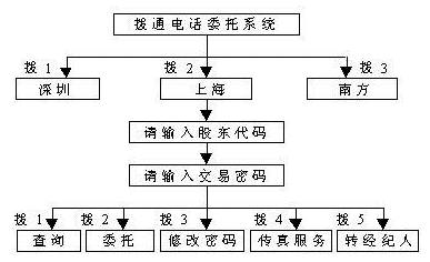 通過該項(xiàng)服務(wù),股民可以在任何地點(diǎn)使用任何一部雙音頻電話方便的向證券公司發(fā)出買入、賣出等各種委托指令,也可以發(fā)出查詢指令,證券公司的電話委托交易系統(tǒng)根據(jù)股民的指令自動(dòng)完成委托及查詢操作,將結(jié)果反饋給股民。股民發(fā)給證券公司的信息,主要為數(shù)碼、數(shù)字,通過雙音頻電話按鍵來傳送。證券公司電話委托交易系統(tǒng)發(fā)給股民的信息,則是用語(yǔ)音傳送的操作及查詢結(jié)果。通過功能擴(kuò)充,還可提供其它配套服務(wù),如將查詢結(jié)果發(fā)送至股民的傳真機(jī)。若股民利用計(jì)算機(jī)接至委托公司,還可享受可視委托等更為多樣的服務(wù)。