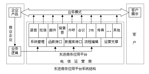 從應(yīng)用角度看,東進(jìn)商務(wù)應(yīng)用平臺將業(yè)務(wù)分為3個部分--企業(yè)端的業(yè)務(wù)邏輯、電信運(yùn)營商端的業(yè)務(wù)實現(xiàn)和客戶端業(yè)務(wù)響應(yīng)。企業(yè)根據(jù)其產(chǎn)品特點(diǎn),制定相應(yīng)的業(yè)務(wù)邏輯,去控制電信運(yùn)營商的商務(wù)應(yīng)用平臺,平臺在業(yè)務(wù)邏輯的控制下,去響應(yīng)客戶端的業(yè)務(wù)需求,由此組成一個智能化的業(yè)務(wù)模式。