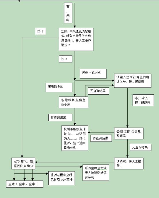 在中興通訊呼叫中心流程設(shè)計上充分體現(xiàn)了CTI技術(shù)以及數(shù)據(jù)庫技術(shù)等IT技術(shù)與星際先進(jìn)的管理理念的融合。該流程的設(shè)計保證將主動提高服務(wù)品質(zhì)的工作集中于對呼叫者最重要的環(huán)節(jié)――對維修網(wǎng)點(diǎn)信息的咨詢上。它為所有呼叫者提供了詳細(xì)、精煉、基本的高品質(zhì)電話服務(wù),同時又根據(jù)電話區(qū)號提供了有針對性的咨詢服務(wù)。