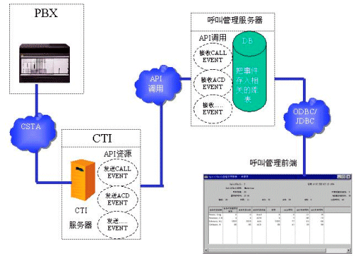 一般來說,各大有能力推出PBX產(chǎn)品的通訊廠商都有自己專用的呼叫管理系統(tǒng)。這些專用的呼叫管理系統(tǒng)可以直接從PBX獲取最高效的消息,而不用通過CTI SERVER。當(dāng)然,這些專用的呼叫管理系統(tǒng)也只能應(yīng)用于專門的PBX產(chǎn)品。 如果運(yùn)營商在選購設(shè)備的時(shí)候,已經(jīng)選購了專用的呼叫管理系統(tǒng),那么開發(fā)商可以對(duì)這個(gè)專門的呼叫管理系統(tǒng)進(jìn)行二次開發(fā)。請(qǐng)看下面的數(shù)據(jù)流程圖: