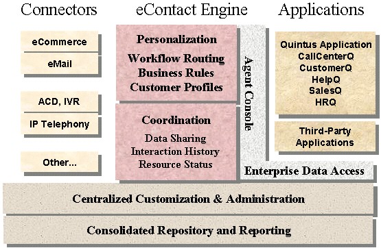 在CRM的實(shí)施中,有很多決定實(shí)施成敗的關(guān)鍵因素,其中之一就是CRM解決方案。目前,市場上的CRM產(chǎn)品林林總總,如國外的Siebel、SAP、Oracle、Clarify、Vantive,國內(nèi)創(chuàng)智的PowerCRM、用友的NC/CRM、聯(lián)成互動(dòng)的MyCRM、中圣的SellWell、TurboCRM等,各有自身的特色和優(yōu)勢。本文將從CRM理念的角度介紹另一款CRM解決方案——Quintus eContact Suit(簡稱QeS)解決方案,以供用戶甄選。