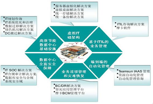 圍繞云計算數(shù)據(jù)中心的建設(shè),華勝天成共開發(fā)了多個解決方案,且每個解決方案均有專業(yè)的售前支持團隊和售后實施團隊,這些解決方案不是分散而無關(guān)的,而是針對用戶的不同情況,在各方面均給予綜合考慮,以最優(yōu)的設(shè)計方案來滿足用戶的需要,并兼顧另外方面的后繼需求。