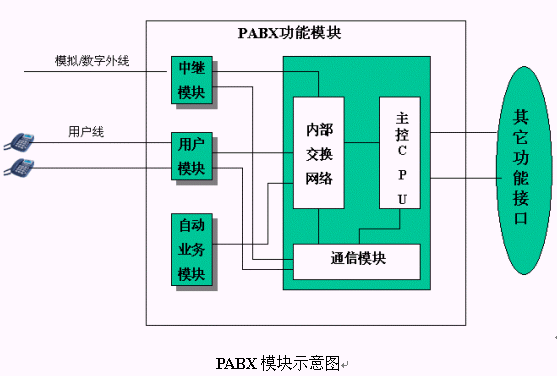 PABX模塊采用了三級分布分散的控制方式,這三級由主控板級、通訊控制級和各功能模塊級組成。各功能模塊單板實現(xiàn)各功能板的自身控制,通訊控制級模塊主要負責主控板級和各功能模塊級之間的數(shù)據(jù)通訊,實現(xiàn)主控板對各功能模塊的協(xié)調(diào)和控制。模塊內(nèi)部采用了先進的內(nèi)存管理技術、先進的通信方式和先進的控制方式,因而獲得了極高的CPU通訊帶寬和處理能力。