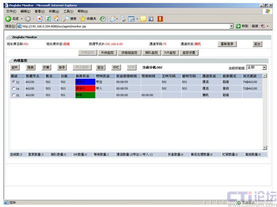 3.模塊界面劃分清晰:Monitor監(jiān)控模塊分為內(nèi)線監(jiān)控、外線監(jiān)控、虛通道監(jiān)控、技能組監(jiān)控和IVR監(jiān)控共五大類。各類別功能獨立運(yùn)行,可根據(jù)企業(yè)對聯(lián)絡(luò)中心班長的職責(zé)劃分,對各類技能組、項目組的班長登錄提供有區(qū)別的監(jiān)控頁面,從而為每位班長的恪盡職守提供了良好的保證。