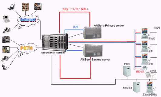 奧迪堅通訊系統(tǒng)有限公司作為CTI通訊平臺的提供商,在技術(shù)上不斷創(chuàng)新,對產(chǎn)品精益求精,尤其體現(xiàn)在對系統(tǒng)的運行安全性的要求上,為了防止電信接入設備或者企業(yè)網(wǎng)絡出現(xiàn)故障而造成的呼叫中心服務中斷,奧迪堅呼叫中心系統(tǒng)提供安全保護冗余切換系統(tǒng),來保障呼叫中心在意外情況下的正常工作,該安全冗余切換系統(tǒng)通過對電源、T1/E1、模擬trunk、分機座席、以及各種網(wǎng)絡鏈路串口等備份切換來實現(xiàn)可靠的運行。除此之外,奧迪堅系統(tǒng)本身也提供強大的安全保障,由于采用先進IP內(nèi)核一體化設計,集傳統(tǒng)PBX、CTI服務器、IVR、ACD、Recording、FAX等眾多設備于一體,這樣有效的避免了因為外掛設備過多以及設備供應商的不同而存在的兼容性的問題,從而降低了給呼叫中心系統(tǒng)帶來的的不穩(wěn)定的安全隱患。在系統(tǒng)之外依靠安全保護冗余切換系統(tǒng),可以實現(xiàn)外線、分機、以及各種鏈路接口的雙倍安全運行。如上圖所示:兩臺奧迪堅的呼叫中心服務器和奧迪堅安全冗余切換系統(tǒng)構(gòu)成呼叫中心熱備份系統(tǒng),在兩臺服務器中安裝所有的呼叫中心功能模塊。通常情況下由主呼叫中心服務器提供系統(tǒng)的正常運行,備份服務器通過安全保護冗余切換系統(tǒng)的服務監(jiān)測模塊來監(jiān)測主服務器的各項設備和鏈路的使用情況,當主服務器遭遇突發(fā)故障不能繼續(xù)工作時,系統(tǒng)馬上實施自動切換,就會通過安全保護冗余切換系統(tǒng)將系統(tǒng)切換到備份的呼叫中心系統(tǒng)上來,此鏈路可以是數(shù)據(jù)、語音、網(wǎng)絡、串口等。當安全保護冗余切換系統(tǒng)自身出現(xiàn)斷電或者其他故障時,所有鏈路均保持正常工作狀態(tài)。
