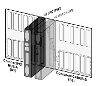 服務(wù)器刀片間的熱備份 背板的各種總線往往會分成兩段,每段有不同的SBC控制。在背板上存在兩個特殊槽位,在這些槽位上的SBC同時連接到這兩段總線上,正常狀態(tài)下一個活動的SBC在控制兩段總線和總線上的設(shè)備,另一個SBC處在備份狀態(tài),如果活動的SBC出現(xiàn)故障,備份SBC會接管兩段總線和應(yīng)用。參見圖2。
