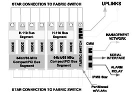 如果我們采用基于CompactPCI標準的刀片服務(wù)器系統(tǒng)來實現(xiàn),系統(tǒng)可能就是完全另外一種樣子(如圖1),這樣的實現(xiàn),首先系統(tǒng)體積小,只要一個刀片服務(wù)器機箱;第二,系統(tǒng)基于標準的體系架構(gòu),開發(fā)和維護容易,成本低廉;第三,系統(tǒng)非常好地集成了語音通信和IP通信,易于部署增值電信業(yè)務(wù);第四,系統(tǒng)具有較好的可擴展性,因為背板提供了豐富的帶寬資源,同時單位空間內(nèi)豐富的插槽,可以安裝更多的服務(wù)器刀片,提供了充足的計算資源;第五,系統(tǒng)還可以利用各種高可靠性和高可管理性的特點。