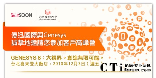 持續(xù)優(yōu)化企業(yè)績(jī)效及培養(yǎng)意見領(lǐng)袖,都是協(xié)助我們?cè)谂_(tái)灣的用戶與其客戶有更佳交流往來的重要作法,因此,我們特別籌辦了‘客戶高峰會(huì)’,全面邀集來自Genesys新加坡、香港及中國(guó)的專家和同儕與您面對(duì)面,進(jìn)行互動(dòng)的知識(shí)分享與意見交換。