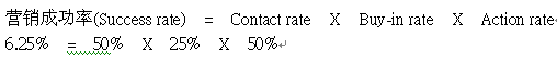 rate(接觸率,能夠聯(lián)系到客戶的比率), Buy-in rate(接受率,聯(lián)系到的客戶里面表達(dá)有興趣的比率), Action rate(成交率,表達(dá)有興趣的客戶里面真正付錢購買的比率)。一般而言,接觸率能達(dá)到50%算是不錯的名單,而接受率能達(dá)到25%算是產(chǎn)品、名單選擇登對,銷售技巧也到位,最后臨門一腳的成交率應(yīng)該要能到50%算是達(dá)標(biāo)了。以下列公式來表達(dá)(標(biāo)準(zhǔn)以上述的比率套用):