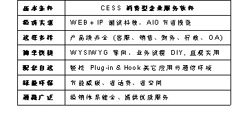 CESS消費(fèi)型服務(wù)軟件具有經(jīng)濟(jì)實(shí)惠、選擇多樣、簡單快捷、配套自選、綠能環(huán)通路廣泛等特點(diǎn),采用Web+IP的潮流科技,AIO節(jié)省投資,使軟件經(jīng)濟(jì)實(shí)惠;CESS軟件產(chǎn)品線齊全,涵蓋客服、銷售、財務(wù)、行政、OA等很多方面,給您多樣選擇;WYSIWYG(所見即所得)導(dǎo)向,業(yè)務(wù)流程DIY,讓您至需要動動鼠標(biāo)就可以DIY您想要得到的設(shè)計,不再需要麻煩IT人員,只管實(shí)用,簡單快捷;輕松Plug-in & Hook其它應(yīng)用與通信環(huán)境,可根據(jù)您的需要配套自選;節(jié)能減碳、省話費(fèi)、省空間,綠色環(huán)保;經(jīng)銷體系健全、提供優(yōu)質(zhì)服務(wù),通路廣泛。