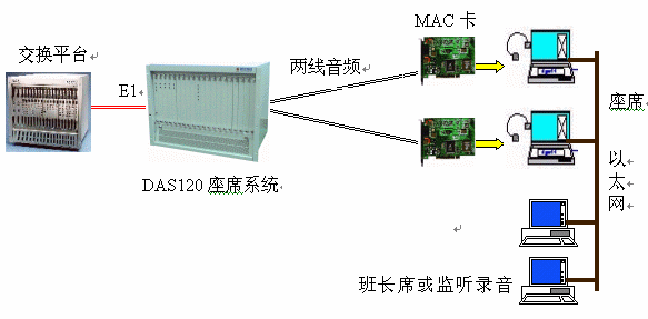 DAS120與億景座席卡MAC配合使用,可使系統(tǒng)的優(yōu)越性發(fā)揮到最大。MAC卡提供的強大功能(收發(fā)DTMF和450HZ信號音,語音錄放等)有效地簡化系統(tǒng)軟件的設計,并可降低系統(tǒng)成本,如EXCEL交換平臺可不用配置DSP卡,IVR可簡化等。還可以有效地降低交換平臺的處理負荷,提高話務處理能力。