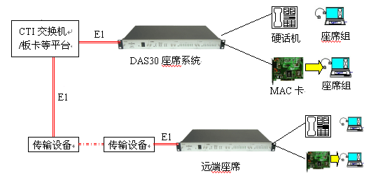 見(jiàn)下圖:DAS30通過(guò)1個(gè)E1接口與交換機(jī)/板卡直接連接,無(wú)需配置數(shù)據(jù),可方便地實(shí)現(xiàn)本地座席接入或遠(yuǎn)端分布式接入(需配合傳輸設(shè)備)。終端可為普通電話機(jī)或MAC座席電話卡。