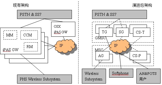 GW軟件改造而來,只需新增CS-P即可?偟膩碚f,核心網(wǎng)的演進(jìn)只是增加CS-P、擴(kuò)容CS-T、原有的iPAS GW軟件升級為TG/AG,就可以建立其一個(gè)具有多種終端接入能力的開放性多媒體VoIP移動(dòng)軟交換網(wǎng)絡(luò),而原有的PHS系統(tǒng)功能又不會受到影響。