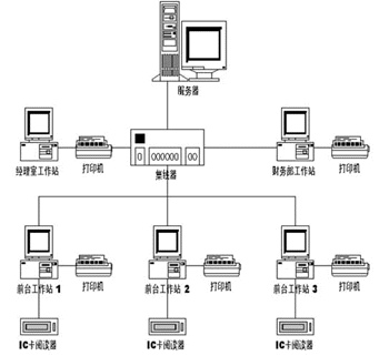 系統(tǒng)由IC卡閱讀器、工作站、服務器、打印機、相應網絡及管理軟件組成。由工作站接收IC卡閱讀器的客戶數據并輸入消費業(yè)務數據,通過網絡保存到服務器。