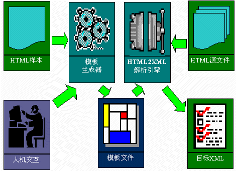 HTML2XML1.0中包括了兩個工具:HTML2XML模板生成器和HTML2XML解析引擎。通過該HTML2XML模板生成器的GUI界面和HTML2XML解析引擎,將HTML文件中的<Table>標記中的數據,根據指導性文件,轉換成XML格式數據,供其他應用程序進行進一步處理。