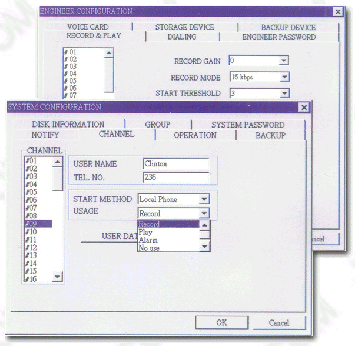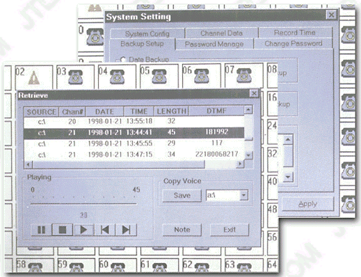 可按通道號(hào),日期,時(shí)間,撥出電話(huà)號(hào)碼四種條件進(jìn)行單個(gè)和組合查詢(xún),查詢(xún)方便快捷,數(shù)據(jù)表的下邊還顯示出數(shù)據(jù)資料的統(tǒng)計(jì)。可以任意播放一個(gè)錄音或選擇多個(gè)錄音依次播放,放音時(shí)將彈出當(dāng)前語(yǔ)音文件的放音進(jìn)度等信息 |