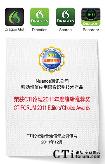 Nuance榮獲“2011年度CTI論壇編輯推薦獎(jiǎng)”
