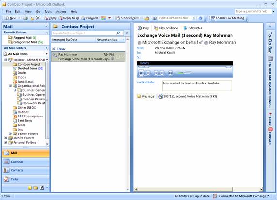 Exchange 統(tǒng)一消息幫助在單個位置合并信息:用戶的收件箱。語音郵件、傳真、電子郵件、約會數據和聯系人都出現在單個位置,使得用戶更容易訪問、查找和操作它們。