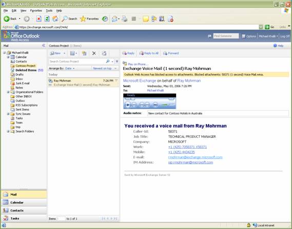 Outlook Web Access 2007,它允許用戶從瀏覽器會話中訪問語音郵件和傳真數據。OWA 2007 提供了對許多 Outlook 2007 功能的基于瀏覽器的無處不在的訪問,包括在計算機或電話機上回放語音郵件消息的能力和創(chuàng)建并收聽音頻附注的能力。(請參見圖3)
