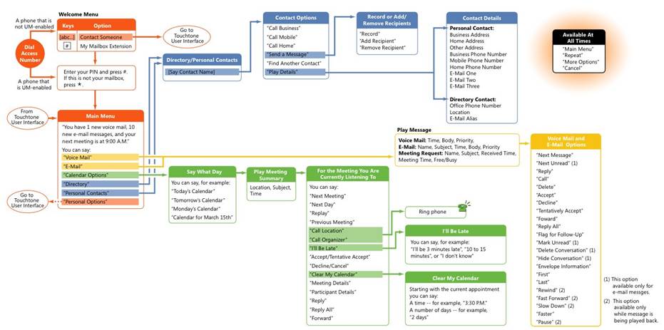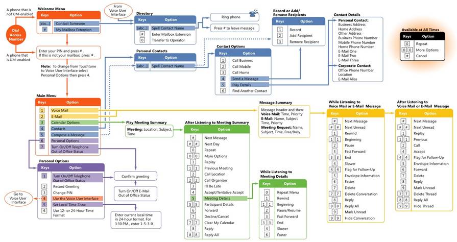 允許用戶通過電話處理他們的消息和日歷數據(包括收聽、轉發(fā)和回復電子郵件,以及發(fā)出、更新或響應會議請求)。用戶可以標記消息以便跟蹤、跳到下一封未讀郵件、隱藏或刪除對話,甚至查找來自特定用戶的消息,這一切全都使用語音導航或標準按鍵式鍵盤來完成。