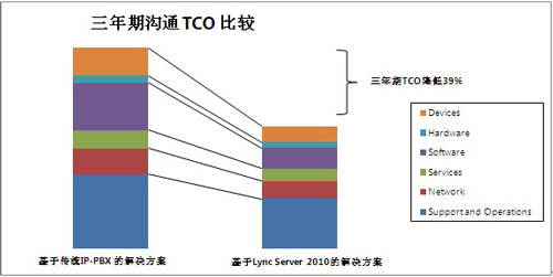 一個(gè)運(yùn)行Microsoft溝通平臺(tái)的大型企業(yè),與運(yùn)行其他基于IP電話的溝通解決方案相比,能夠?qū)⑷昶诳傮w擁有成本(TCO)平均每年降低39%。一個(gè)典型的擁有5,000用戶(hù)的企業(yè)在三年內(nèi)就可以實(shí)現(xiàn)超過(guò)200萬(wàn)美元的CapEx和OpEx凈成本減少。大中小型企業(yè)都可以從中獲利,然而,一個(gè)典型的擁有50,000用戶(hù)的去哦也在三年內(nèi)可以節(jié)省250萬(wàn)美元,并且一個(gè)典型的擁有1,000用戶(hù)的組織在三年內(nèi)可以實(shí)現(xiàn)超過(guò)75萬(wàn)美元的成本減少。