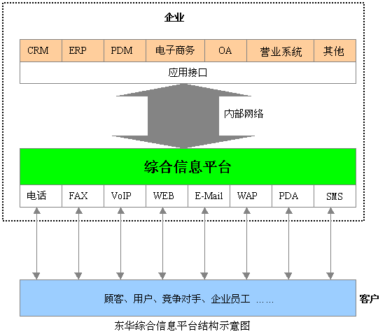 東華集團(tuán)綜合信息平臺(tái)系統(tǒng)可集中企業(yè)客戶(hù)服務(wù)的優(yōu)勢(shì)資源,采用人工業(yè)務(wù)代表服務(wù)與自動(dòng)語(yǔ)音服務(wù)相結(jié)合的形式,通過(guò)電話(huà)、Email、Web、尋呼、IP電話(huà)/傳真、視頻、段消息等接入方式和服務(wù)手段,向客戶(hù)提供業(yè)務(wù)受理、信息查詢(xún)、商品定購(gòu)服務(wù),以及接受客戶(hù)的咨詢(xún)、建議及投訴,也可以通過(guò)主動(dòng)撥出做社會(huì)調(diào)查、市場(chǎng)調(diào)查、商品直銷(xiāo)及資費(fèi)欠費(fèi)催繳等。