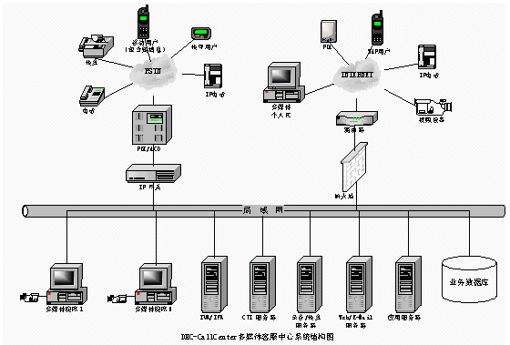 普通電話(huà)用戶(hù)通過(guò)PSTN接入DHC- UIPS綜合信息平臺(tái)系統(tǒng),接受話(huà)務(wù)員服務(wù)或自動(dòng)業(yè)務(wù)流程。傳真用戶(hù)進(jìn)入系統(tǒng)可以進(jìn)行傳真業(yè)務(wù)。計(jì)算機(jī)用戶(hù)也可以通過(guò)Internet訪(fǎng)問(wèn)企業(yè)客戶(hù)服務(wù)系統(tǒng)主頁(yè),獲得服務(wù)。同時(shí)計(jì)算機(jī)用戶(hù)也可以通過(guò)Internet利用網(wǎng)絡(luò)電話(huà)的功能要求話(huà)務(wù)員服務(wù)或自動(dòng)業(yè)務(wù)流程。