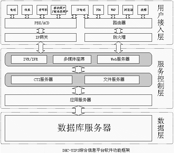 即DHC-UIPS綜合信息平臺(tái)的接入端,包括IVR流程、人工坐席等,它是用戶(hù)進(jìn)入多媒體客服中心客服系統(tǒng)的入口,它將直接面對(duì)用戶(hù)并收集各種信息。支持電話(huà)、傳真、電子郵件、WEB訪(fǎng)問(wèn)、WAP、PDA、IP電話(huà)、網(wǎng)絡(luò)電話(huà)、視頻電話(huà)等多種方式接入。