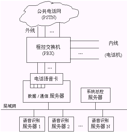 (4)應(yīng)用層軟件:安裝在數(shù)據(jù)/通信服務(wù)器上,負(fù)責(zé)與交換機(jī)和總控程序進(jìn)行交互。它根據(jù)識(shí)別結(jié)果向交換機(jī)發(fā)送電話(huà)轉(zhuǎn)接指令(例如DTMF鍵碼)。