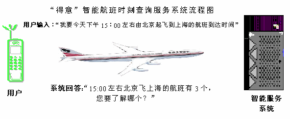 使用"得意"智能航班時刻查詢服務(wù)系統(tǒng),用戶可以通過短信/WAP/互聯(lián)網(wǎng)以自然語言的方式與服務(wù)系統(tǒng)進行互動,方便地查詢各個航班的時刻,以及相關(guān)的信息。當(dāng)用戶在對話過程中遇到困難時,系統(tǒng)還會主動引導(dǎo)用戶獲取想要的信息,能為乘客和交通機構(gòu)提供很好的服務(wù)手段,實現(xiàn)真正的"智能"。