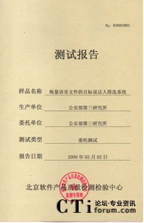 CTI論壇(ctiforum)06月25日消息: 2009年3月02-10日:北京軟件產(chǎn)品質量檢測檢驗中心對《海量語音文件的目標說話人篩選系統(tǒng)》進行了全面測試包括用戶文檔、功能性、可靠性、易用性、可維護性等多個特性。測試結果表明《海量語音文件的目標說話 2009年3月02-10日,北京軟件產(chǎn)品質量檢測檢驗中心對《海量語音文件的目標說話人篩選系統(tǒng)》進行了全面人篩選系統(tǒng)》滿足軟件相關國家標準中的要求,系統(tǒng)在模擬測試環(huán)境中運行正常、穩(wěn)定,正式通過北京軟件產(chǎn)品質量檢測檢驗中心的嚴格測試,系統(tǒng)的漏識率和誤警率分別達到了2.81%和 2.81%。