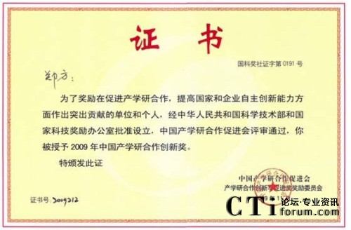 CTI論壇(ctiforum)11月26日消息(記者 潘婷):2009年11月7日,得意公司董事長鄭方博士獲中國產(chǎn)學研合作促進會2009年度中國產(chǎn)學研合作創(chuàng)新獎。該獎勵是面向國內(nèi)在促進產(chǎn)學研合作及創(chuàng)新方面做出突出貢獻的單位及個人所頒發(fā)的年度榮譽獎。