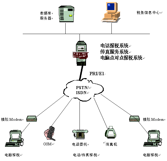 以上三種電子報稅方式,除網(wǎng)上報稅,稅務(wù)機(jī)關(guān)需通過建立專門的網(wǎng)站,配置專線接上因特網(wǎng)外,其他兩種報稅方式(即電話報稅和電腦點(diǎn)對點(diǎn)報稅),都需要用戶通過電話線撥入到稅務(wù)機(jī)關(guān),從通訊上說,這兩種方式涉及三種通訊模式,即:語音,傳真及數(shù)據(jù)通訊,為了實(shí)現(xiàn)通訊資源的共享,節(jié)省線路及設(shè)備投資,稅務(wù)機(jī)關(guān)非常希望將這三種通訊模式(語音,傳真,數(shù)據(jù))建立在一個統(tǒng)一的接入平臺中。而市場上一般的產(chǎn)品都無法做到將這三種通訊方式統(tǒng)一在一個平臺中,用戶需購買語音卡,傳真卡來滿足電話報稅的需求,購買Modem Pool和多串口卡來滿足電腦點(diǎn)對點(diǎn)報稅的需求,從而造成設(shè)備投資上的很大浪費(fèi),通訊線路資源也不能得到共享。