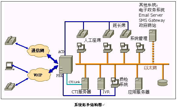 《政府呼叫中心系統(tǒng)》采用聲軟科技的《XCCP呼叫中心系統(tǒng)》平臺,主要由PBX交換機、CTI服務器、IVR系統(tǒng)、應用服務器、數據庫服務器、TTS系統(tǒng)和座席系統(tǒng)等硬件設備和系統(tǒng)應用軟件組成。它以電話服務為主要服務方式、結合計算機信息系統(tǒng)的資料數據,為用戶提供全方位的服務。