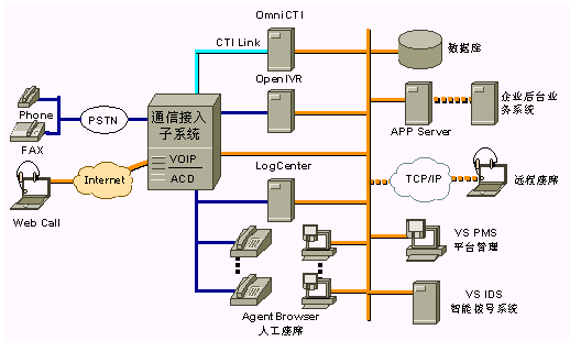 VS CommSuites除了提供傳統(tǒng)呼叫中心功能外,還增加了IPCC功能,是一個全方位的解決方案,下面是系統(tǒng)的結構圖:
