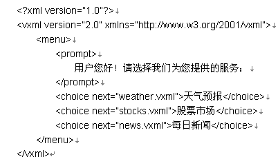下面是一個(gè)VoiceXML的簡(jiǎn)單例子。當(dāng)用戶與電話語音系統(tǒng)接通以后,將會(huì)聽到語音合成的提示信息"用戶您好!請(qǐng)選擇我們?yōu)槟峁┑姆⻊?wù):"。當(dāng)用戶說"股票市場(chǎng)",語音瀏覽器就會(huì)通過語音識(shí)別功能識(shí)別用戶的選擇,然后把對(duì)話流程轉(zhuǎn)向另一個(gè)VoiceXML腳本文件stocks.vxml。stocks.vxml腳本文件則是一個(gè)專門向用戶提供股票市場(chǎng)相關(guān)服務(wù)的語音網(wǎng)頁。