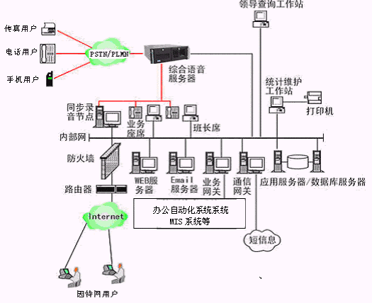 整個多媒體呼叫中心系統(tǒng)對外面向用戶,對內(nèi)與整個市勞動局相聯(lián)系,與內(nèi)部管理/服務(wù)等結(jié)為一體,能夠把從用戶那里獲得的各種信息、數(shù)據(jù)全部貯存在龐大的數(shù)據(jù)倉庫中,供領(lǐng)導(dǎo)者作分析和決策之用;形成了對外服務(wù)于客戶,對內(nèi)管理、分析、決策系統(tǒng)相結(jié)合的多媒體呼叫中心。