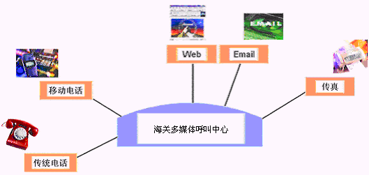 客戶利用電話、傳真、電子郵件、因特網(wǎng)、手機(jī)等撥打某一特服號碼(如9xxxx)進(jìn)入海關(guān)多媒體呼叫中心系統(tǒng),本系統(tǒng)依托海關(guān)緝私相關(guān)的MIS系統(tǒng)、OA度系統(tǒng)等各類業(yè)務(wù)技術(shù)支持系統(tǒng)和網(wǎng)絡(luò)系統(tǒng),通過自動語音服務(wù)或人工受理等方式全天24小時不間斷地為客戶提供各種服務(wù)。