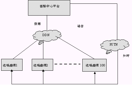 所謂PSTN+DDN的聯(lián)網(wǎng)方式是遠(yuǎn)端座席和主呼叫中心的語(yǔ)音和數(shù)據(jù)互連是分開(kāi)來(lái)的,彼此互相不干擾。語(yǔ)音方面遠(yuǎn)端座席和主呼叫中心的相聯(lián)與前兩種方式不同,是主呼叫中心通過(guò)外呼將話路接到遠(yuǎn)端座席處。數(shù)據(jù)方面遠(yuǎn)端座席和主呼叫中心的相聯(lián)仍然直接通過(guò)DDN相連。