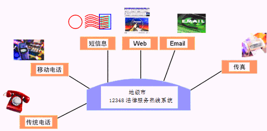居民利用電話、傳真、手機等撥打某一特服號碼(如12348)進入地級市法律服務熱線系統(tǒng),本系統(tǒng)依托地級市司法行政部門/法院各類業(yè)務技術支持系統(tǒng)和網(wǎng)絡系統(tǒng),通過人工受理或自動語音服務等方式全天24小時不間斷地為人民群眾提供各種法律服務;形成了對外服務于百姓的無形窗口,對內(nèi)管理、分析、決策系統(tǒng)相結(jié)合的多媒體呼叫中心。